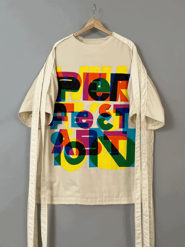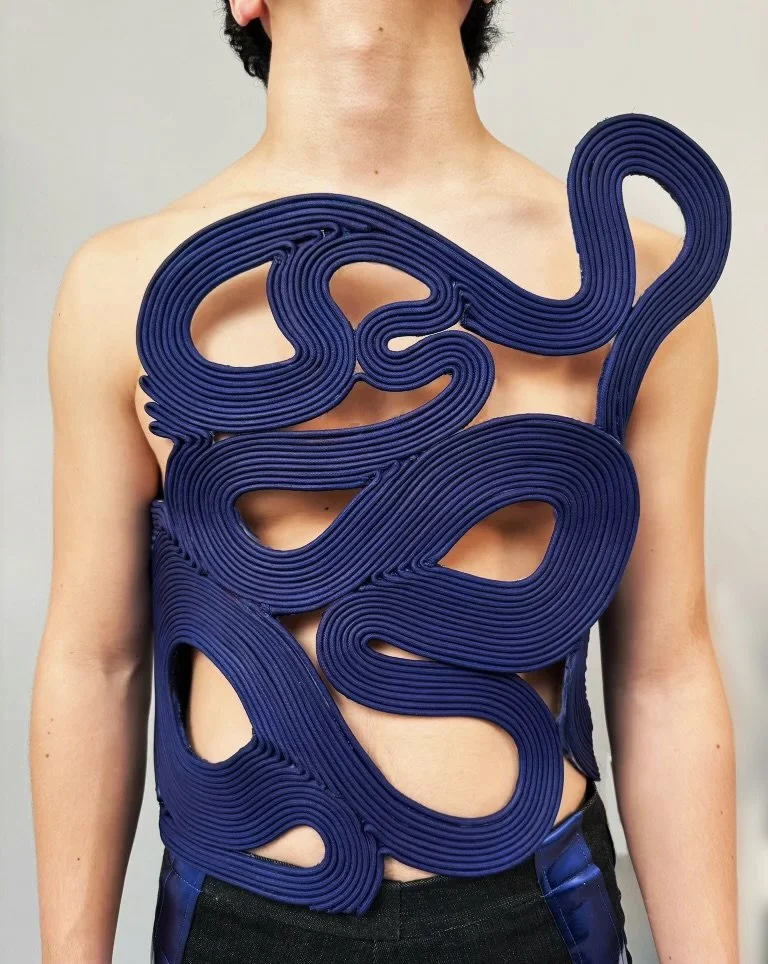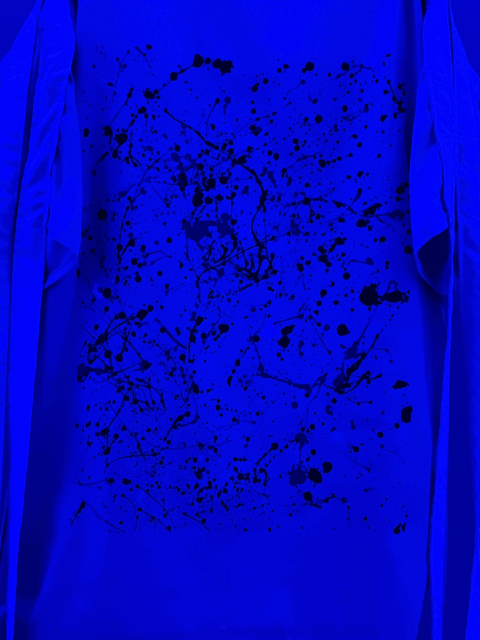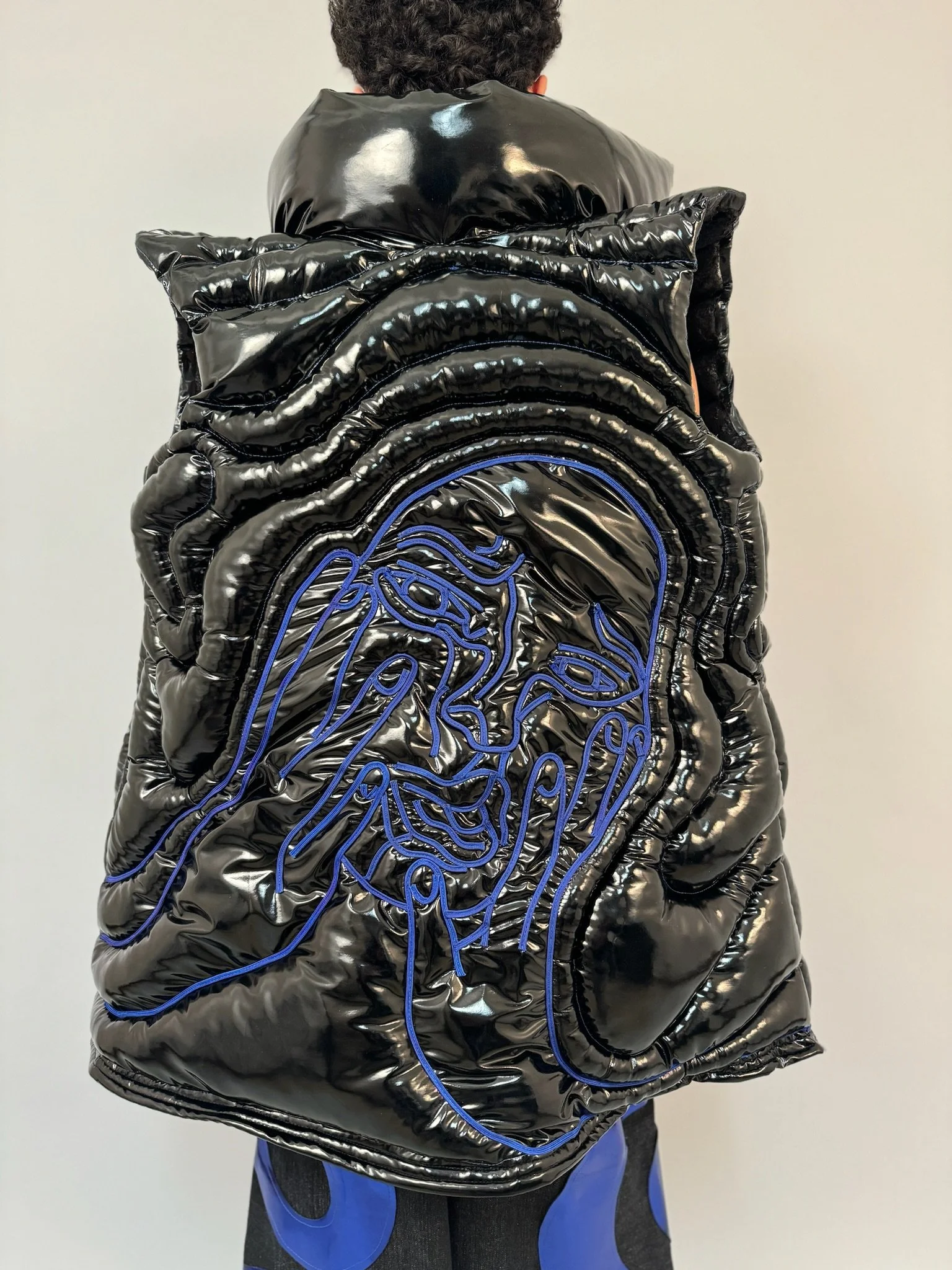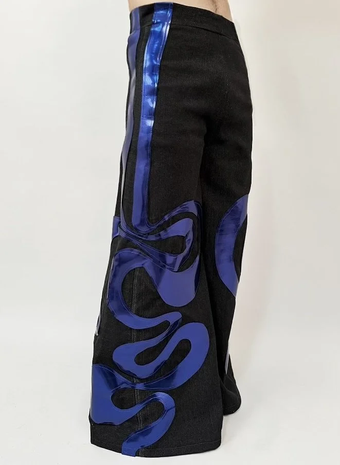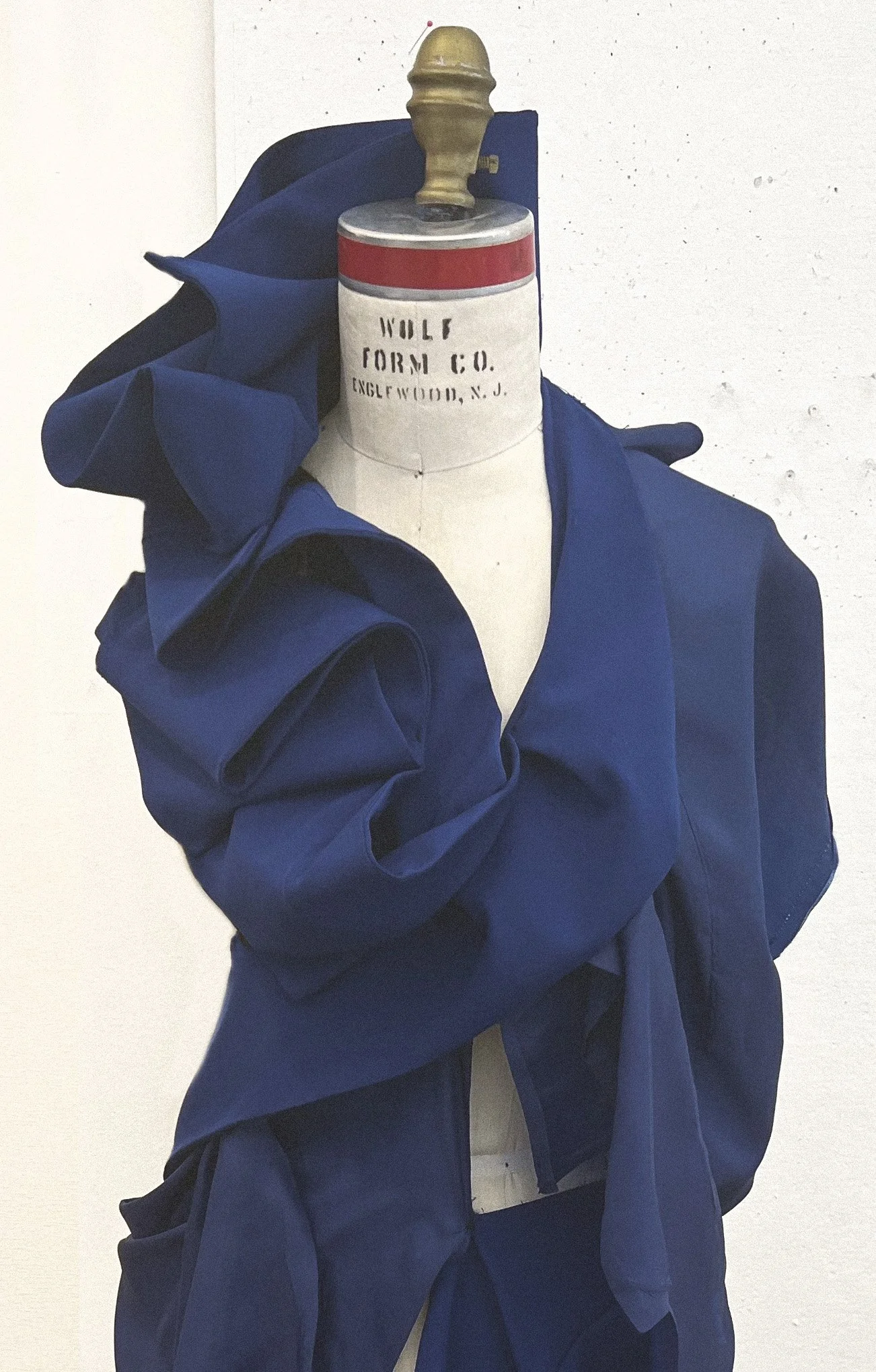 Deconstructed and reconstructed from a second-hand blue suit set, this piece is wholly reimagined.